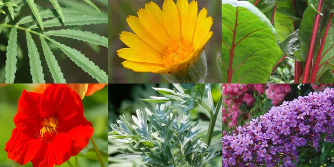 Protiv štetočina: Menta, timijan, bosiljak, češnjak – mirisni repelenti za lisne uši i neke gljivice; neven ispušta limonen koji smanjuje bijele mušice u kontroliranim uvjetima.